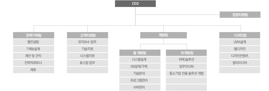 당사의 조직은 전략기획,고객지원,개발,디자인,경영지원팀으로 구성되어 있으며, 다양한 구축 경험을 가진 전문 인력을 보유하고 있습니다.